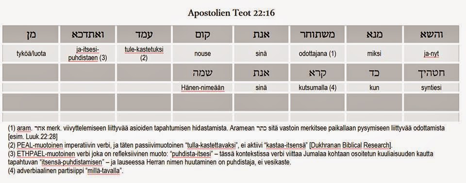 Ja nyt, mitä viivytelet! Nouse ja huuda avuksi hänen nimeään, anna kastaa itsesi ja pestä pois syntisi.' Apo 22:16 RK