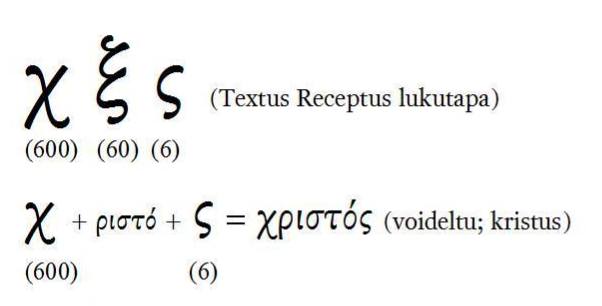 Textus Receptus (ja vanha kreikankielinen papyrusteksti Ilmestyskirjasta) käyttää tässä luvusta 666 muotoa χξς, joka on tulkittu merkitsevän kolmea asiaa.
